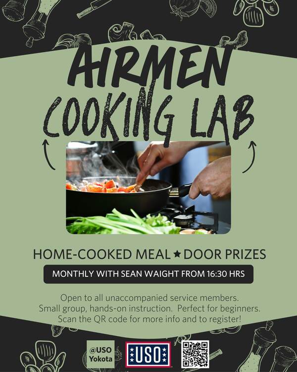 Airman Cooking Nite is a monthly, hands-on cooking series led by one of our talented USO volunteers. Each month, he’ll choose a featured meal and guide participating Airmen through basic cooking skills and techniques while everyone cooks together. Airmen who help prepare the meal will enjoy the finished dish alongside volunteers and patrons. It’s a fun, relaxed way to learn new skills, connect with others, and serve the community.