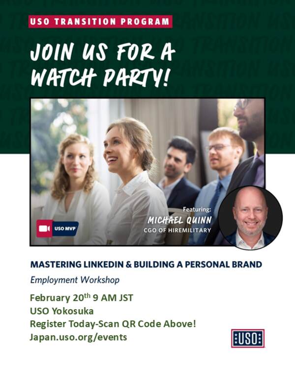 Join us for a watch party where the USO will live-stream the “Mastering LinkedIn” 2-hour workshop facilitated by Michael Quinn. This workshop is designed to equip you with the tools you need to navigate LinkedIn, leverage networking opportunities, access critical resources, and understand the hiring process.
