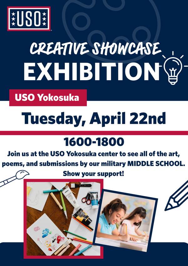 Join us at the USO Yokosuka Center for a Creative Showcase Pop-up Gallery featuring amazing artwork, poems, and original creations by our talented Middle school children. Come show your support, enjoy live poetry readings, and grab some refreshments while you take in all the creativity on display.