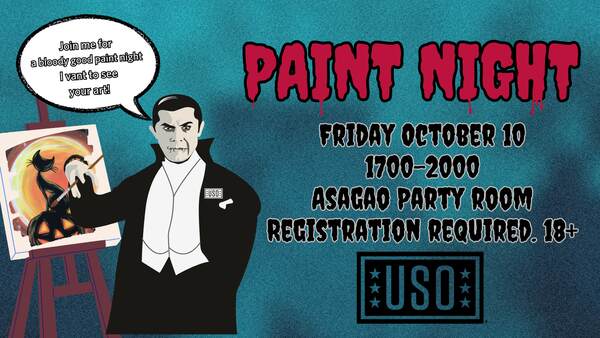Get into the spooky spirit with USO Yokosuka at our Halloween-themed Paint Night — no tricks, just treats and creativity! Whether you’re a seasoned artist or just here for the fun, you’ll enjoy step-by-step guidance to create a hauntingly cute masterpiece to take home. No booze, no pressure — just a chill evening of painting, laughs, and Halloween vibes. Costumes encouraged! Registration required | Ages 18+