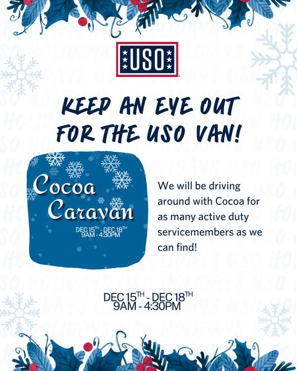 🎅 Cocoa & Cheer: USO Holiday Deliveries ☕🎁 Delivery Dates: December 15–18 Delivery Hours: 08:30 – 16:30