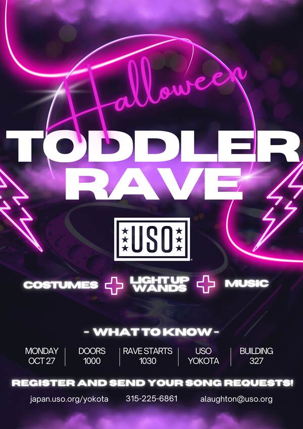Join USO Yokota for a Halloween Toddler Rave filled with music, costumes, and glowing fun! Little ones can dress up, grab a light stick, and enjoy a lively, family-friendly celebration made just for them.