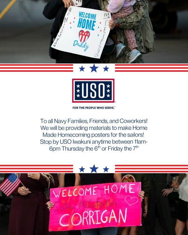 *To all Navy Families, Friends, and Coworkers! * We will be providing materials to make Home Made Homecoming posters for the sailors! Stop by USO Iwakuni anytime between 11am-6pm Thursday the 6th or Friday the 7th to create your own. Poster boards, markers, stickers, etc. will be provided, but please feel free to bring your own!