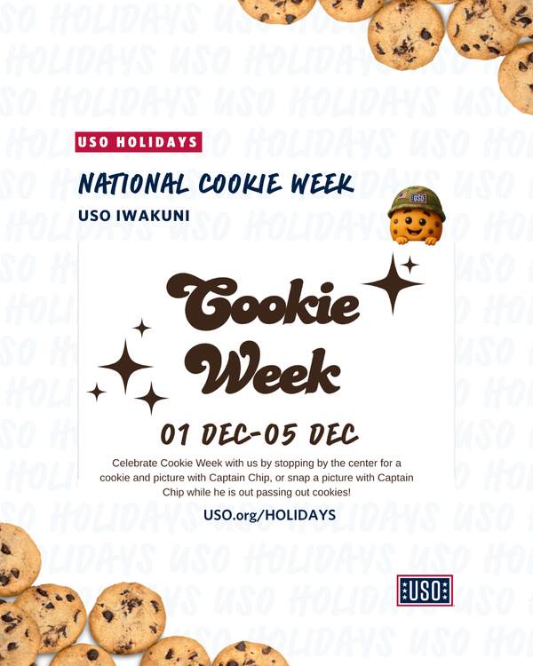 Get ready to kick off the holiday season with National Cookie Week at USO Iwakuni! From Monday through Friday, we’ll be spreading holiday cheer (and the delicious smell of cookies!) all around base.